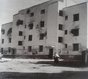 Στη φωτογραφία οι προσφυγικές πολυκατοικίες, στη συμβολή των οδών Βρυούλων και Φώκαιας στην Καισαριανή, με τα ίχνη της μάχης, φωτογράφος Dmitri Kessel.