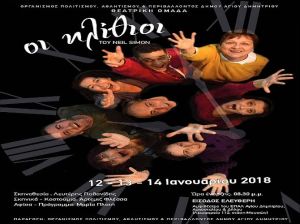 Το κλασσικό έργο ''Οι ηλίθιοι'' του Neil Simon, ανεβάζει η θεατρική Ομάδα του Δήμου Αγ. Δημητρίου, σε τρεις παραστάσεις, στις 12, 13 και 14 Ιανουαρίου 2018, στο αμφιθέατρο του 1ου ΕΠΑΛ Αγίου Δημητρίου (Αργοστολίου & Δήλου).