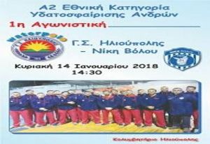 Έναρξη του πρωταθλήματος και των αγωνιστικών υποχρεώσεων της ομάδας μας στην Α2 Εθνική Κατηγορία Ανδρών ''2018'', την Κυριακή 14 Ιανουαρίου 2018 στις 14:30 στην έδρα μας, το Δημοτικό Κολυμβητήριο Ηλιούπολης, με αντίπαλο τη Νίκη Βόλου, στο πλαίσιο της διεξαγωγής της Α΄ Φάσης του Α΄ Γύρου, η οποία θα διεξαχθεί σε 14 αγωνιστικές, από 14 Ιανουαρίου έως 27 Μαΐου 2018.