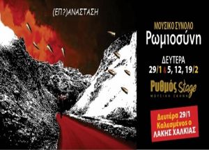 Τα αντάρτικα τραγούδια, που συντρόφευσαν το λαό στις πιο δύσκολες στιγμές της ιστορίας του, θα ακούσουμε σε ένα μοναδικό πρόγραμμα στο Ρυθμό Stage, ερμηνευμένα με ξεχωριστό τρόπο από το «Μουσικό Σύνολο Ρωμιοσύνη» υπό την καλλιτεχνική διεύθυνση του Τεό Λαζάρου τις Δευτέρες 29 Ιανουαρίου και 5 , 12 και 19 Φεβρουαρίου.