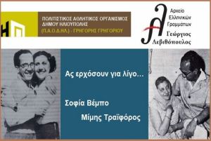 Την Κυριακή 11 Μαρτίου, στις 7 μ.μ., στο Θέατρο του Δημαρχιακού Μεγάρου Ηλιούπολης ο «ΠΑΟΔΗΛ-Γρηγόρης Γρηγορίου» και το Δημοτικό Ωδείο Ηλιούπολης «Απόστολος Μόσχος», σε συνεργασία με το «Αρχείο Ελληνικών Γραμμάτων Γεώργιος Λεβιθόπουλος» και τον Βασίλη Τραϊφόρο διοργανώνουν ένα αφιέρωμα στη Σοφία Βέμπο και τον Μίμη Τραϊφόρο, καθώς συμπληρώνονται ακριβώς 40 χρόνια από τον θάνατο της μεγάλης ερμηνεύτριας και 20 χρόνια από τον θάνατο του συντρόφου της και σπουδαίου δημιουργού.