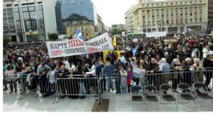 Στα Προπύλαια η συγκέντρωση ξεκίνησε νωρίς το μεσημέρι της Κυριακής. Είχε στηθεί και εξέδρα για τους ομιλητές.
