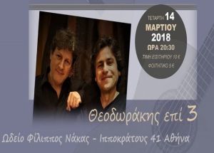 Στο ξεχωριστό αυτό ρεσιτάλ για κιθάρα και φωνή "Θεοδωράκης επί 3", ο Νίκος Θεοδωράκης θα ερμηνεύσει τραγούδια σε ποίηση Γιάννη Θεοδωράκη που μελοποίησε ο μεγάλος μας συνθέτης Μίκης Θεοδωράκης.