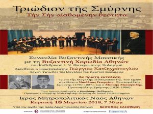 Μια μεγάλη συναυλία με τον τίτλο «Τριώδιον της Σμύρνης» (Την Σην αισθομένην θεότητα) θα δώσει η Βυζαντινή Χορωδία Αθηνών του Καθεδρικού Ι. Ν. Φανερωμένης Χολαργού, με διευθυντή τον Γεώργιο Χατζηχρόνογλου, Πρωτοψάλτη και Άρχοντα Υμνωδό της Μεγάλης του Χριστού Εκκλησίας, στον Ιερό Μητροπολιτικό Ναό Αθηνών την Κυριακή 18 Μαρτίου 2018, ώρα 7.30 μμ.