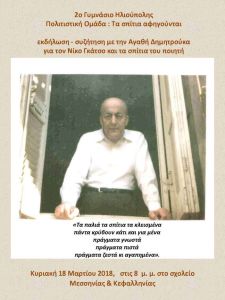 Η Πολιτιστική ομάδα του σχολείου μας σας προσκαλεί την Κυριακή στις 18 Μάρτη, στις 8 το βράδυ, στο σχολείο, Μεσσηνίας & Κεφαλληνίας, σε μια ξεχωριστή εκδήλωση.