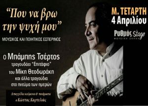 Tην Mεγάλη Τετάρτη 4 Απριλίου ο Μπάμπης Τσέρτος τραγουδάει "Επιτάφιο" του Μίκη Θεοδωράκη και άλλα τραγούδια στο πνεύμα των ημερών στη μουσική σκηνή Ρυθμός Stage.