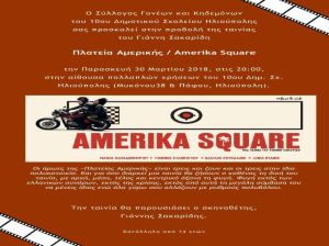 Ο Σύλλογος Γονέων και Κηδεμόνων του 10ου Δημοτικού Σχολείου Ηλιούπολης, σας προσκαλεί στην προβολή της ταινίας AMERIKA SQUARE την Παρασκευή 30/03/18 και ώρα 08:00 μ.μ. στην Αίθουσα πολλαπλών χρήσεων του σχολείου μας.