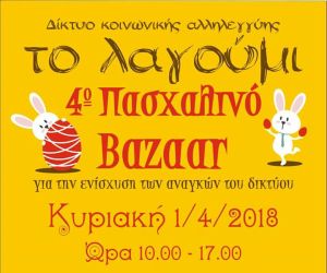Το δίκτυο κοινωνικής αλληλεγγύης Λαγούμι, σας περιμένει την Κυριακή 1η Απριλίου στην ανοιξιάτικη γιορτή αλληλεγγύης, το 4ο πασχαλινό μπαζάρ του, από τις 10 το πρωί μέχρι τις 5 το απόγευμα.