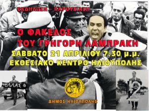 Ο Δήμος Ηλιούπολης διοργανώνει σε συνεργασία με το Ίδρυμα «Γρηγόρης Λαμπράκης» και την «Φωτογραφική Λέσχη Ηλιούπολης» εκδήλωση για την «Παρουσίαση του Απόρρητου Φακέλου της Ασφάλειας για τον Γρηγόρη Λαμπράκη» .