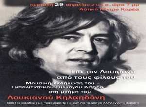 O Εκπολιτιστικός Σύλλογος Καρέα διοργανώνει μουσική εκδήλωση αφιερωμένη στην μνήμη του αείμνηστου καλλιτέχνη Λουκιανού Κηλαηδόνη που θα πραγματοποιηθεί την Κυριακή 29/4/2018 και ώρα 7.00 μ.μ. στο Αστικό Κέντρο Καρέα.