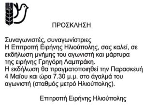 Η τοπική Επιτροπή Ειρήνης Ηλιούπολης διοργανώνει εκδήλωση τιμής και μνήμης του αγωνιστή της ΕΙΡΗΝΗΣ, την Παρασκευή 4 Μαΐου 2018 στις 7:30 το απόγευμα, στο άγαλμα του αγωνιστή (σταθμός Μετρό Ηλιούπολης) και καλεί τους φίλους της ΕΕΔΥΕ να συμμετέχουν.