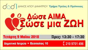 Η Τράπεζα Αίματος του Δήμου Αγ. Δημητρίου, διοργανώνει την καθιερωμένη εθελοντική αιμοδοσία, την Τετάρτη 9 Μαΐου από τις 13:30 έως τις 17:30, στα Δημοτικά Ιατρεία (Θεσσαλίας 10).