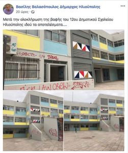 Το έντονο πρόβλημα των τεράστιων φθορών που αντιμετωπίζουν οι δήμοι στους δημόσιους χώρους και κυρίως στα σχολεία άνοιξε ο Δήμαρχος Ηλιούπολης Βασίλης Βαλασόπουλος με την ανάρτηση που έκανε για το graffiti που έγινε αμέσως μετά το βάψιμο του του 12ου Δημοτικού Σχολείου Ηλιούπολης.