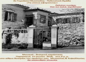 Στις 15 Ιουνίου, ημέρα Παρασκευή στις 9 το βράδυ στο αίθριο θεατράκι του 2ου Γυμνασίου Ηλιούπολης, (Μεσσηνίας και Κεφαλληνίας, Αστυνομικά Ηλιούπολης), η πολιτιστική ομάδα του σχολείου μας θα παρουσιάσει μία μουσικο - θεατρική παράσταση με τίτλο: «Τα σπίτια αφηγούνται».