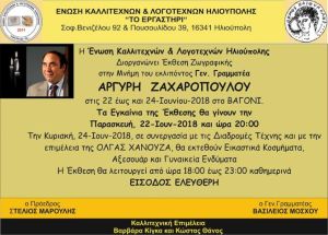 Η Ένωση Καλλιτεχνών & Λογοτεχνών Ηλιούπολης, διοργανώνει Έκθεση Ζωγραφικής, στην Μνήμη του εκλιπόντος Γεν. Γραμματέα ΑΡΓΥΡΗ ΖΑΧΑΡΟΠΟΥΛΟΥ, στις 22 έως και 24-Ιουνίου-2018 στο ΒΑΓΟΝΙ.
