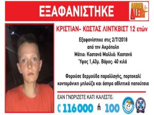 Στις 2/7/2018, στις 00:00 π.μ., εξαφανίστηκε ο Κρίστιαν-Κώστας (ον) Λίντκβιστ (επ) 12 ετών από την περιοχή της Ακρόπολης.