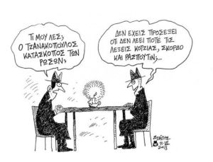 Αλληλοδουλευόμαστε για την εθνικότητα των Σκοπιανών, στρουθοκαμηλίζουμε με τη μετανάστευση των νέων, παίζουμε τη ρώσικη ρουλέτα των εντυπώσεων με τις συντάξεις, δηλώνουμε φόρου υποτελείς για 100 χρόνια, καλούμε τον Ερντογάν για τέιον στο Μαξίμου, τρέχουμε σκούζοντας ζήτουλες στο ΝΑΤΟ ή στο Γιούρογκρουπ, κανονίζει ο Τσίπρας με την κυρία Μέρκελ συμφωνίες κατεργαραίων για το προσφυγικό'κι όλα αυτά τα λέμε κυβέρνηση - αντιπολίτευση - Τύπο - θεσμούς - κανονικότητα, ενώ στην πραγματικότητα πρόκειται για απεικάσματα.