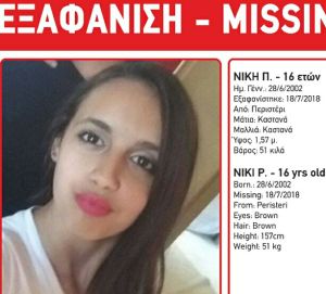 Αγωνία για τη 16χρονη Νίκη Π. που εξαφανίστηκε τις πρώτες πρωινές ώρες στις 18/7/2018 από το Περιστέρι.
