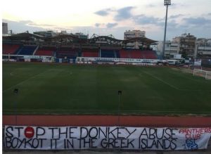 Ενόψει και της αναμέτρησης με τον ΟΦΗ για την πρώτη αγωνιστική της φετινής Superleague, ανέβασαν πανό στις κερκίδες, που γράφει στα αγγλικά «Σταματήστε την κακοποίηση των γαϊδουριών. Να τα μποϊκοτάρετε στα ελληνικά νησιά».