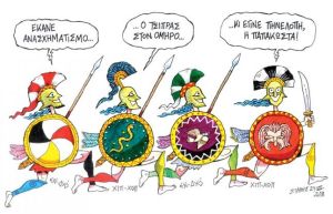 Λόρδος Ναύαρχος του Πλωϊμίου ο κ. Φώτης - Φανούρης Κουβέλης (ο… Πυρπολητής). Τέλος, οι γίγαντες - άτλαντες της κυβέρνησης Αλέκος Φλαμπουράρης («αέρα χρωστάμε, με αέρα θα τους πληρώσουμε»), Χριστόφορος Βερναρδάκης (να πηγαίνει στο Σούπερ Μάρκετ χωρίς άγχος, βρε παιδιά) και Δημήτρης Τζανακόπουλος (ο Δημοσθένης ταλιμπάν και ο Κικέρων σπαχής).