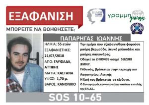 Από τις 21 Ιουλίου 2018 έχει εξαφανιστεί, χωρίς να έχει δώσει σημεία ζωής, ο 55χρονος Ιωάννης Παπαρήγας, από τη Γλυφάδα.