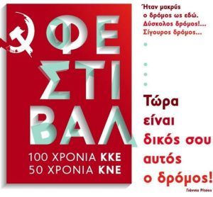 Με σύνθημα «Ήταν μακρύς ο δρόμος ως εδώ. Δύσκολος δρόμος!... Σίγουρος δρόμος... Φεστιβάλ 100 χρόνια ΚΚΕ - 50 χρόνια ΚΝΕ... Τώρα είναι δικός σου αυτός ο δρόμος!», το Φεστιβάλ έχει ξεκινήσει το ταξίδι του απ' άκρη σ' άκρη της Ελλάδας.