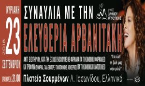 Την Κυριακή 23 Σεπτεμβρίου η Ελευθερία Αρβανιτάκη έρχεται στον Δήμο Ελληνικού -Αργυρούπολης στην πλατεία Σουρμένων στο Ελληνικό,με τα τραγούδια της ζωής της, τα τραγούδια της ζωής μας τελικά...