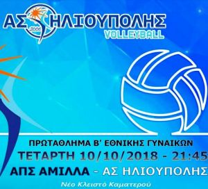Η γυναικεία ομάδα του Α.Σ.Ηλιούπολης σήμερα Τετάρτη 10/10/2018, στις 21:45 για την 1η αγωνιστική του Πρωταθλήματος Β’ Εθνικής Γυναικών, αντιμετωπίζει την αντίστοιχη ομάδα ΑΠΣ Άμιλλα στο Νέο Κλειστό Καματερού.