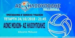Η γυναικεία ομάδα του Α.Σ.Ηλιούπολης , σήμερα Τετάρτη 24/10/2018 στις 21:45 για την 3η αγωνιστική του Πρωταθλήματος Β' Εθνικής Γυναικών (Β' Όμιλος), αντιμετωπίζει την αντίστοιχη ομάδα ΑΟΝΣ Μίλων στο Κλειστό Μίλωνα.