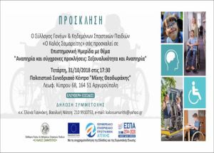 Ο σύλλογος Γονέων & Κηδεμόνων Σπαστικών Παιδιών «Ο ΚΑΛΟΣ ΣΑΜΑΡΕΙΤΗΣ» οργανώνει επιστημονική Ημερίδα με θέμα: "Αναπηρία και σύγχρονες προκλήσεις: Σεξουαλικότητα και Αναπηρία", την Τετάρτη, 31 Οκτωβρίου 2018 και ώρα 17:30, στο Πολιτιστικό Συνεδριακό Κέντρο “Μίκης Θεοδωράκης” (Λεωφ. Κύπρου 68, 164 51 Αργυρούπολη).