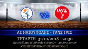 Για την 4η αγωνιστική του Πρωταθλήματος Β' Εθνικής Γυναικών (Β' Όμιλος) η ομάδα του Α.Σ.Ηλιούπολης, την Τετάρτη 31/10/2018 στις 21:30 υποδέχεται την αντίστοιχη ομάδα ΓΑΝΣ ΙΡΙΣ στο Α' Κλειστό Ηλιούπολης.