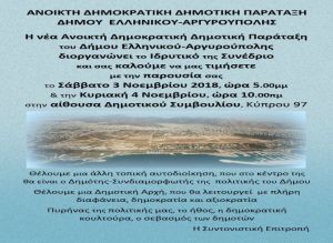 Η νέα Ανοικτή Δημοκρατική Δημοτική Παράταξη Ελληνικού-Αργυρούπολης διοργανώνει το Ιδρυτικό της Συνέδριο και καλεί τους πολίτες του Δήμου στην αίθουσα του Δημοτικού Συμβουλίου, Κύπρου 97, το Σάββατο 3 Νοεμβρίου 2018, ώρα 5.00μμ και την Κυριακή 4 Νοεμβρίου, ώρα 10.00πμ.