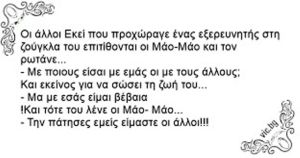 Αυτοί του λένε ‘’καλά καλά, άστα αυτά, για πες μας με ποιους είσαι με εμάς ή με τους άλλους’’. Ο δύσμοιρος τους λέει, ‘’με εσάς είμαι ρε παιδιά, μα τι λέτε τώρα, με εσάς είμαι’’. Και οι τύποι του απαντούν ‘’φίλε την πάτησες εμείς είμαστε οι άλλοι’’.