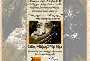Η παράσταση θα ανέβει το Σάββατο 9 Φλεβάρη 2019 στις 8 μ.μ. στην αίθουσα εκδηλώσεων του Δημαρχείου Καισαριανής.