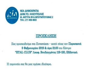 Συνεστίαση και κοπή πίτας από την ΔΗΜ. Τ.Ο. Νέας Δημοκρατίας Ηλιούπολης Εντός των τειχών 04 Φεβρουαρίου 2019 Η Δημ.Τ.Ο. ΝΔ Ηλιούπολης, μας προσκαλεί στην Συνεστίαση - κοπή πίτας που θα πραγματοποιηθεί την Παρασκευή 8 Φεβρουαρίου στις 09.00 μ.μ. στο "ETAL CLUB"(Λεωφόρος Βουλιαγμένης 118-120 - Ελληνικό) Τηλέφωνο κρατήσεων: 6940512493 ΔΗΜ. Τ.Ο. Νέας Δημοκρατίας Ηλιούπολης Ηλιούπολη Ηλιούπολη για όλους ilioupoli www.ilioupoligiaolous.gr Προβλήθηκε 972 φορές Δείτε Επίσης: Εντός των τειχών Δείτε τα Όλα ΗΛΙΟΥΠΟΛΗ - ΠΑΝΑΡΓΕΙΑΚΟΣ 1η αγωνιστική Super League 2 (play out) 10 Φεβρουαρίου 2026 15.02.2025 - ώρα 03.00 μ.μ. Προγραμματισμένες διακοπές ρεύματος (Ηλιούπολη - 11.02.2026) 08 Φεβρουαρίου 2026 ΕΝΗΜΕΡΩΣΗ ΑΠΟ ΔΕΔΔΗΕ Ισοπαλιά για τον ΧΑΡΑΥΓΙΑΚΟ και για τον ΦΩΣΤΗΡΑ ΗΛΙΟΥΠΟΛΗΣ 07 Φεβρουαρίου 2026 ΚΥΡΙΑΚΗ 08.02.2026 ΚΑΙ ΩΡΑ 03.00 Μ.Μ. ΙΣΟΠΑΛΙΑ ΓΙΑ ΤΗΝ ΔΙΑΝΑ 07 Φεβρουαρίου 2026 ΣΑΒΒΑΤΟ 07.02.2026 ΚΑΙ ΩΡΑ 03.00 Μ.Μ. 19η αγωνιστική για ΔΙΑΝΑ, ΧΑΡΑΥΓΙΑΚΟ και 18η αγωνιστική για ΦΩΣΤΗΡΑ ΗΛΙΟΥΠΟΛΗΣ 07 Φεβρουαρίου 2026 ΣΑΒΒΑΤΟ 7 ΚΑΙ ΚΥΡΙΑΚΗ 8 ΦΕΒΡΟΥΑΡΙΟΥ 2026 Σύλλογος Εκπαιδευτικών Π.Ε. Ηλιούπολης "Μ. ΠΑΠΑΜΑΥΡΟΣ'': ΑΝΑΦΟΡΙΚΑ ΜΕ ΤΑ ΕΡΓΑΤΙΚΑ ΑΤΥΧΗΜΑΤΑ ΠΟΥ ΓΙΝΟΝΤΑΙ ΣΤΑ ΣΧΟΛΕΙΑ ΜΑΣ 06 Φεβρουαρίου 2026 Πριν λίγες μέρες συνέβη ένα εργατικό ατύχημα σε συναδέλφισσα που εργάζεται στο 3ο ΔΣ Ηλιούπολης Συνελήφθη 20χρονος για 13 ληστείες σε βάρος ανηλίκων στην Αττική - Αναζητούνται 2 συνεργοί του 01 Φεβρουαρίου 2026 Η συμμορία δρούσε στις περιοχές των Αγίων Αναργύρων, της Ηλιούπολης, του Ελληνικού, του Αγίου Δημητρίου, της Αργυρούπολης, του Ιλίου και των Αχαρνών Ισοπαλία για ΔΙΑΝΑ, ΧΑΡΑΥΓΙΑΚΟ και ΦΩΣΤΗΡΑ ΗΛΙΟΥΠΟΛΗΣ 01 Φεβρουαρίου 2026 3 ΙΣΟΠΑΛΙΕΣ