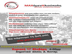 Μας ενδιαφέρει ιδιαίτερα η γνώμη σας για το πώς θα συνεχίσουμε και θα δράσουμε αποτελεσματικότερα για να προασπίσουμε το δικαίωμα για μια αξιοπρεπή ζωή σε μια πόλη που θα εξυπηρετεί τις λαϊκές ανάγκες, κόντρα στα συμφέροντα της οικονομικής ολιγαρχίας, τις αντιλαϊκές πολιτικές των κυβερνήσεων και τα μνημόνια, τις επιλογές των δημοτικών αρχών που υποκλίνονται στον Κλεισθένη Ι και τους κανόνες της αγοράς, όπως του Β. Βαλασόπουλου αλλά και των συστημικών συνδυασμών στην Ηλιούπολη. Θέλουμε τη συμμετοχή σας στην προσπάθεια μας, που λειτουργεί με κέντρο τη συνέλευση της κίνησης και τη δημοκρατική ισότιμη συμμετοχή όλων των αγωνιστών.