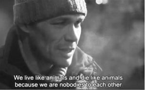 Κι ο ηλίθιος απαντάει: «Ζούμε σαν ζώα και πεθαίνουμε σαν ζώα επειδή βλέπουμε ο ένας τον άλλον σαν να μην είναι τίποτα».