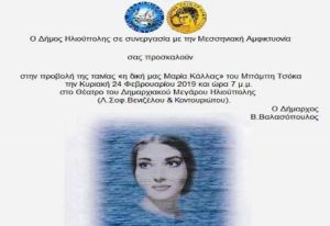 Ο Δήμος Ηλιούπολης σε συνεργασία με την Μεσσηνιακή Αμφικτυονία, σας προσκαλούν στην προβολή της ταινίας «η δική μας Μαρία Κόλλας» του Μπάμπη Τσόκα την Κυριακή 24 Φεβρουαρίου 2019 και ώρα 7 μ.μ. στο Θέατρο του Δημαρχιακού Μεγάρου Ηλιούπολης (Λ.Σοφ.Βενιζέλου & Κοντουριώτου).
