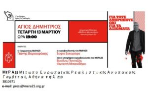 Στο δρόμο προς τις Ευρωεκλογές το ΜέΡΑ25 και ο γραμματέας του κόμματος, Γιάνης Βαρουφάκης, σας περιμένουν την Τετάρτη 13 Μαρτίου στον Άγιο Δημήτριο, στις 19:00, στο Δημοτικό Θέατρο «Μελίνα Μερκούρη», Αγίου Δημητρίου 55 σε μια μεγάλη ανοιχτή συζήτηση για το μέλλον την Πατρίδας μας μέσα σε μια Ευρωπαϊκή Ένωση που κινδυνεύει.