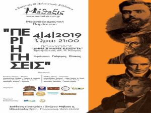 Ο Χορευτικός Πολιτιστικός Σύλλογος ''Μέθεξις", σας προσκαλεί την Πέμπτη 4/4/2019, στη μουσικοχορευτική παράσταση που θα πραγματοποιήσει με τίτλο, "ΠΕΡΙΗΓΗΣΕΙΣ ".