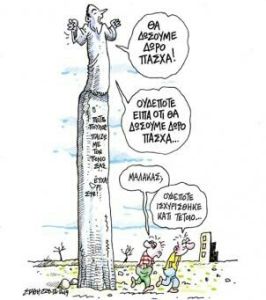 Τσιρώνης! Τς τς τς! Συγκρατηθείτε! είπαμε είναι καθήκον σας να μην τρελαθείτε. Δισεκατομμύρια μας έχουν κλέψει (υπερπλεόνασμα, κι απ’ αυτό το υπερπλεόνασμα) μας επιστρέφουν δυο κατοστάρικα! Δεν θα τρελαθούμε κιόλας! Απ’ τα δικά μας λεφτά είναι τα επιδόματα (για μας), τα δισεκατομμύρια (για αυτούς).