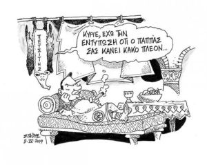 Τέλος, η Ελλάδα είναι περισσότερο από κάθε άλλη φορά κούφια από πολιτισμό, γράμματα και ταυτότητα. Όχι πως δεν υπάρχουν νέα σπουδαία μυαλά στις επιστήμες και τις τέχνες, αλλά δεν υπάρχει το πλαίσιο μέσα στο οποίο οι δυνάμεις αυτές θα μπορούσαν να ανθούν. Η χώρα σαρώνεται από ασκέρια κηφήνων και κομματόσκυλων, ραγιάδων, γενίτσαρων και χαρεμιών.