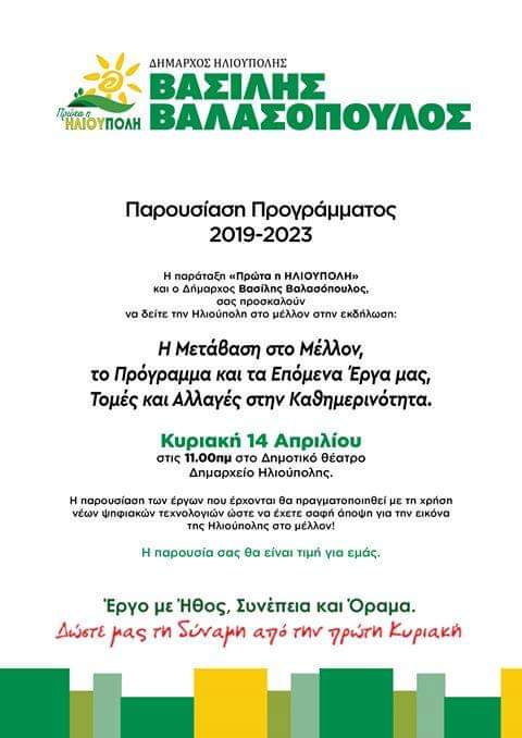 Πρώτα η Ηλιούπολη: ''Παρουσίαση Προγράμματος 2019-2023'' Εντός των τειχών 11 Απριλίου 2019 Πρώτα η Ηλιούπολη. Η Μετάβαση στο Μέλλον, το Πρόγραμμα και τα επόμενα Έργα μας, Τομείς και Αλλαγές στην Καθημερινότητα. Πρώτα η Ηλιούπολη Ηλιούπολη για όλους Ηλιούπολη www.ilioupoligiaolous.gr ilioupoli Προβλήθηκε 644 φορές Δείτε Επίσης: Εντός των τειχών Δείτε τα Όλα Σύλλογος Εκπαιδευτικών Π.Ε. Ηλιούπολης "Μ. ΠΑΠΑΜΑΥΡΟΣ'': ΑΝΑΦΟΡΙΚΑ ΜΕ ΤΑ ΕΡΓΑΤΙΚΑ ΑΤΥΧΗΜΑΤΑ ΠΟΥ ΓΙΝΟΝΤΑΙ ΣΤΑ ΣΧΟΛΕΙΑ ΜΑΣ 06 Φεβρουαρίου 2026 Πριν λίγες μέρες συνέβη ένα εργατικό ατύχημα σε συναδέλφισσα που εργάζεται στο 3ο ΔΣ Ηλιούπολης Συνελήφθη 20χρονος για 13 ληστείες σε βάρος ανηλίκων στην Αττική - Αναζητούνται 2 συνεργοί του 01 Φεβρουαρίου 2026 Η συμμορία δρούσε στις περιοχές των Αγίων Αναργύρων, της Ηλιούπολης, του Ελληνικού, του Αγίου Δημητρίου, της Αργυρούπολης, του Ιλίου και των Αχαρνών Ισοπαλία για ΔΙΑΝΑ, ΧΑΡΑΥΓΙΑΚΟ και ΦΩΣΤΗΡΑ ΗΛΙΟΥΠΟΛΗΣ 01 Φεβρουαρίου 2026 3 ΙΣΟΠΑΛΙΕΣ 18η αγωνιστική για ΔΙΑΝΑ, ΧΑΡΑΥΓΙΑΚΟ και 17η αγωνιστική για ΦΩΣΤΗΡΑ ΗΛΙΟΥΠΟΛΗΣ 30 Ιανουαρίου 2026 Σάββατο 31.01.2026 και ώρα 03.00 μ.μ. και Κυριακή 01.02.2026 και ώρα 03.00 μ.μ. ΙΣΟΠΑΛΙΑ ΓΙΑ ΤΗΝ ΗΛΙΟΥΠΟΛΗ (18η ΑΓΩΝΙΣΤΙΚΗ) 24 Ιανουαρίου 2026 ΚΥΡΙΑΚΗ 25.01.2026 ΚΑΙ ΩΡΑ 03.00 Μ.Μ. Νίκη για τον ΧΑΡΑΥΓΙΑΚΟ, ισοπαλία για την ΔΙΑΝΑ και νίκη για τον ΦΩΣΤΗΡΑ ΗΛΙΟΥΠΟΛΗΣ 24 Ιανουαρίου 2026 ΣΑΒΒΑΤΟ 24.01.2026 ΚΑΙ ΩΡΑ 03.00 Μ.Μ. ΚΑΛΛΙΘΕΑ - ΗΛΙΟΥΠΟΛΗ (18η αγωνιστική) 23 Ιανουαρίου 2026 ΚΥΡΙΑΚΗ 25.01.2026 ΚΑΙ ΩΡΑ 03.00 Μ.Μ. 17η αγωνιστική για ΔΙΑΝΑ, ΧΑΡΑΥΓΙΑΚΟ και 16η αγωνιστική για ΦΩΣΤΗΡΑ ΗΛΙΟΥΠΟΛΗΣ 23 Ιανουαρίου 2026 Σάββατο 24.01.2026 και ώρα 03.00 μ.μ.