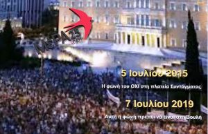 Ναι, είμαστε οι άνθρωποι της διπλανής πόρτας που ακριβώς 4 χρόνια και δυό μέρες μετά το δημοψήφισμα, στις 7 Ιουλίου 2019, κάποιοι από αυτούς που βρίσκονταν στην πλατεία Συντάγματος, θα ανέβουν τα σκαλοπάτια για να συνεχίσουν να φωνάζουν αυτό το ΟΧΙ μέσα στη βουλή.