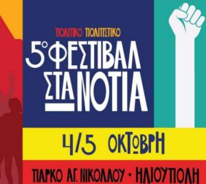 Οι αριστερές/αντικαπιταλιστικές κινήσεις ΜΑΧόμενη Ηλιούπολη, Εκτός Πλάνου - Αντικαπιταλιστική Κίνηση Ελληνικού Αργυρούπολης και Αριστερή Πρωτοβουλία Γλυφάδας - με την αριστερά της ρήξης & της ανατροπής, σας προσκαλούν στο 5ο πολιτικό - πολιτιστικό φεστιβάλ στα νότια πο θα γίνει στο πάρκο Αγ Νικολάου (Τουμπάζη & Αχ Παράσχου) στην Ηλιούπολη, 4 & 5 Οκτώβρη