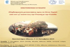 Το Τμήμα Ιταλικής Γλώσσας και Φιλολογίας του Εθνικού και Καποδιστριακού Πανεπιστημίου Αθηνών (Πρόγραμμα Μεταπτυχιακών Σπουδών «Ελληνοϊταλικές Σπουδές: Ιστορία, Λογοτεχνία και Κλασική Παράδοση») σε συνεργασία με το Κέντρο Μελετών Ιονίου οργανώνουν επιστημονικό συνέδριο με θέμα «Πληθυσμιακές μετακινήσεις προς τα Ιόνια Νησιά: από τον 13ο αιώνα έως την Ένωση με την Ελλάδα».