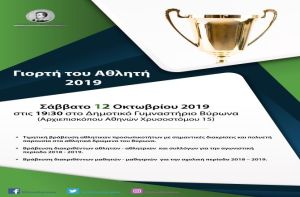 Τη «Γιορτή του Αθλητή» διοργανώνει και φέτος ο Δήμος Βύρωνα, το Σάββατο 12 Οκτωβρίου 2019 και ώρα 19:30 στο Δημοτικό Γυμναστήριο του Δήμου (Αρχιεπισκόπου Αθηνών Χρυσοστόμου 15).