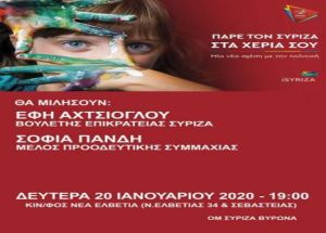 Ο ΣΥΡΙΖΑ – Προοδευτική Συμμαχία πραγματοποιεί ανοιχτή πολιτική εκδήλωση, τη Δευτέρα 20 Ιανουαρίου και ώρα 07:00 μ.μ. στον κινηματογράφο «Νέα Ελβετία» στο Βύρωνα (Ν.Ελβετίας 34 & Σεβαστείας).