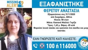 "Στις 31/1/2020, κατά τις βραδινές ώρες, εξαφανίστηκε από την περιοχή του Ζωγράφου, η Αναστασία Φερέτου, 58 ετών.
