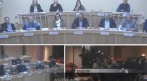 Συγκεκριμένα μέλη του Ρουβίκωνα (άνδρες και γυναίκες) εισέβαλαν και διέκοψαν το συμβούλιο πετώντας τρικάκια.